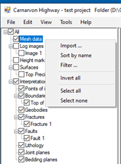 OpenOutcrop allows multiple models (meshes) to be present in a project. To import new meshes into a new or existing project, simply right click on the node labelled “Mesh data” in left hand panel of the screen as below, and select Import…