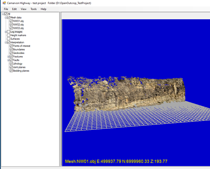 All outcrop models are loaded as “meshes”. Meshes contain the 3D coordinate of each point on the face of the outcrop and information on how those points are connected to form the face of the outcrop (triangulation). In addition, meshes (also known as models) contain information on the color of each point or provides reference to images (known as textures) that color the face from photographic elements. Textures are usually supplied as picture (e.g., jpeg or png) files.