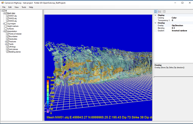 When a mesh is selected the properties are displayed in the panel at the top right-hand corner of the screen. The entries that are not dimmed (read only) can be changed to recolor or redisplay the selected mesh in other ways. For example, changing the overlay type to “Dip Direction” will result in the following –