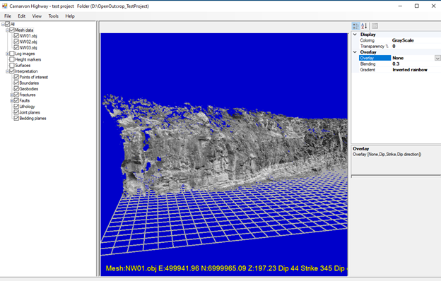 The “transparency” property can be useful if you have multiple meshes (say on both sides of a road cutting) to compare boundary interpretations on both sides of the outcrop.