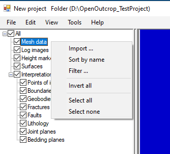 Once an existing project has been opened using File/Open Project or File/Recent or alternatively created from scratch using File/New , a tree view is displayed on the left hand side of the screen. The tree view is where new data can be added, deleted, renamed etc.
