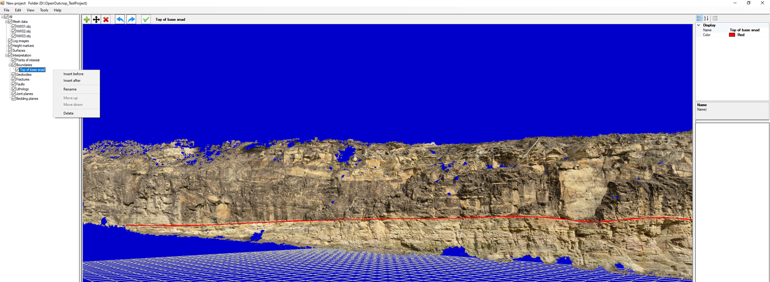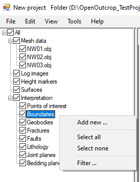 Each menu revealed by right clicking a node is context sensitive, and different options will be revealed depending on the type of node clicked. For example if we right click on the Boundaries node under Interpretation you will see the following