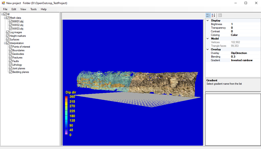 Subsequently, once the data has been added, you can left click on any new mesh and the properties for that mesh will be displayed on the RH side of the screen in the properties window. In the example below, three meshes have been loaded. Each of the properties for each mesh can be changed to display the mesh in a variety of different ways. In the following example we have changed the way the selected mesh is displayed by overlaying dip direction.