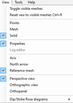 If a mesh is made inactive by unticking it in the tree view, the default view remains unchanged, i.e. the view encompasses the meshes that have been unticked. The default view centers the default “View to …” position to the center of all active meshes. At time, this can make the rotation of meshes appear non-intuitive. Click on this option to direct OpenOutcrop to recalculate the view positions based only on active meshes.